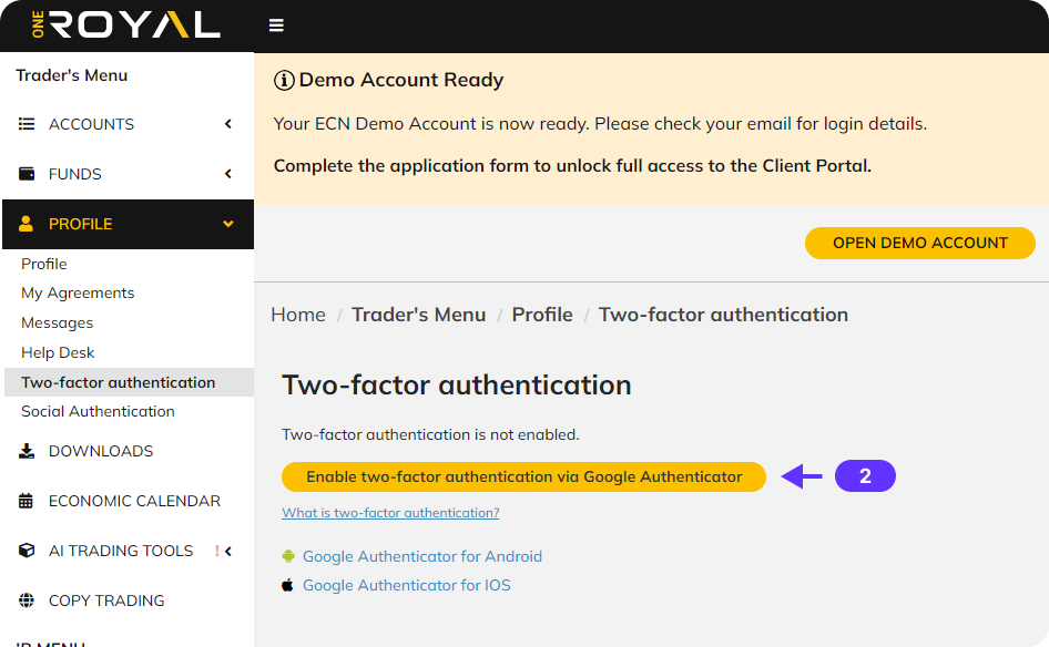 برای اضافه کردن تایید هویت دو مرحله‌ای (2FA) به حساب کاربری خود، لطفاً مراحل زیر را انجام دهید: