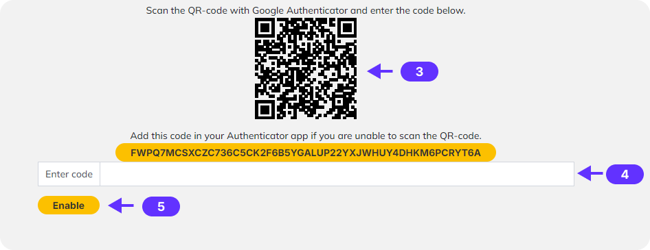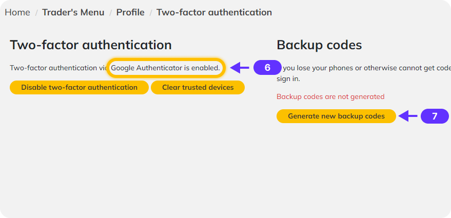 برای امنیت بیشتر، اگر دسترسی به برنامه Google Authenticator خود را از دست دادید، می‌توانید کدهای پشتیبان ایجاد کنید. کافیست روی دکمه‌ای که در صفحه 2FA ارائه شده است کلیک کنید تا این کدها را ایجاد و به طور ایمن ذخیره کنید.