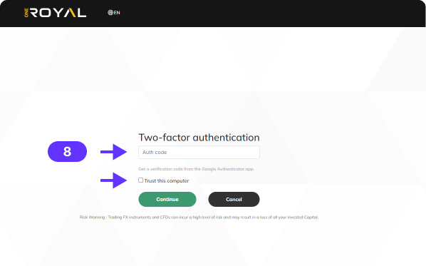 دفعه بعد که وارد حساب OneRoyal خود می‌شوید، از شما خواسته می‌شود کد تولید شده توسط برنامه 2FA خود را وارد کنید. کافیست برنامه Google Authenticator خود را باز کنید، کد را دریافت کرده و آن را در صفحه ورود وارد کنید، سپس دکمه ادامهبرای راحتی بیشتر، می‌توانید موارد زیر را بررسی کنید به این کامپیوتر اعتماد کنید کادر را علامت بزنید تا از وارد کردن کد هر بار که از دستگاه مورد اعتماد خود وارد سیستم می‌شوید، جلوگیری شود.